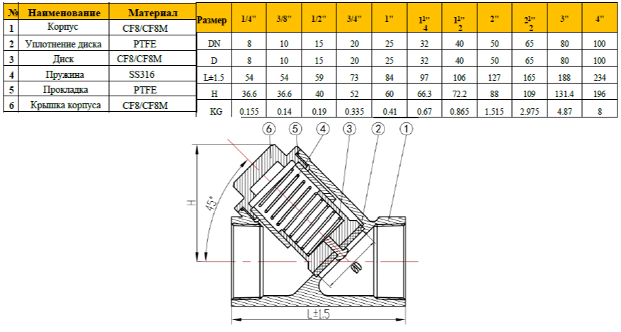 Клапан обратный муфтовый Y-обр. Ду 50 (2, “60.3 мм) 2' AISI 304 (CF8), нержавеющий, резьбовой